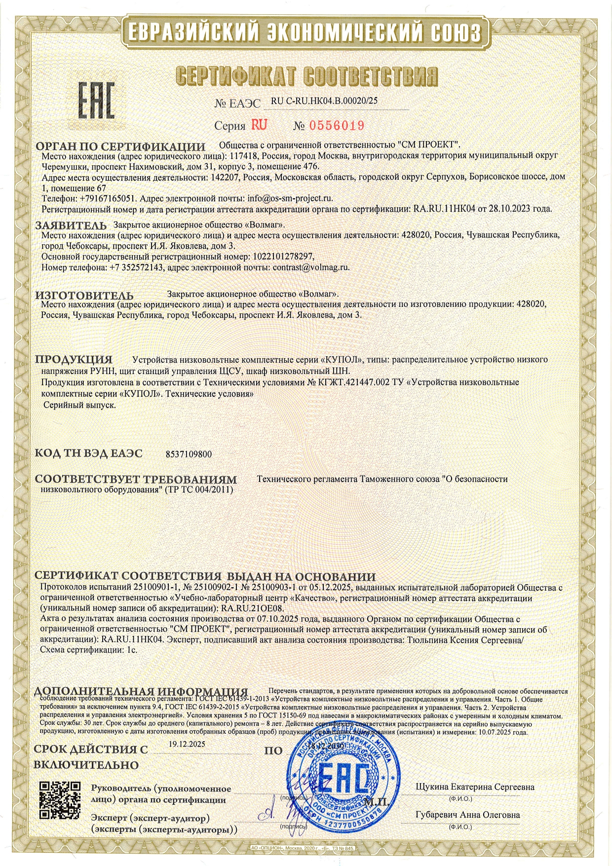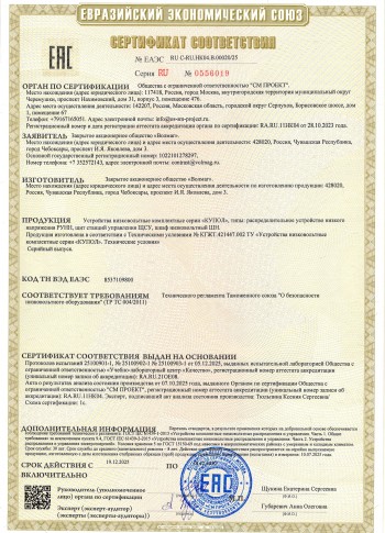 Сертификат соответствия ТР ТС 004 НКУ распределения и управления